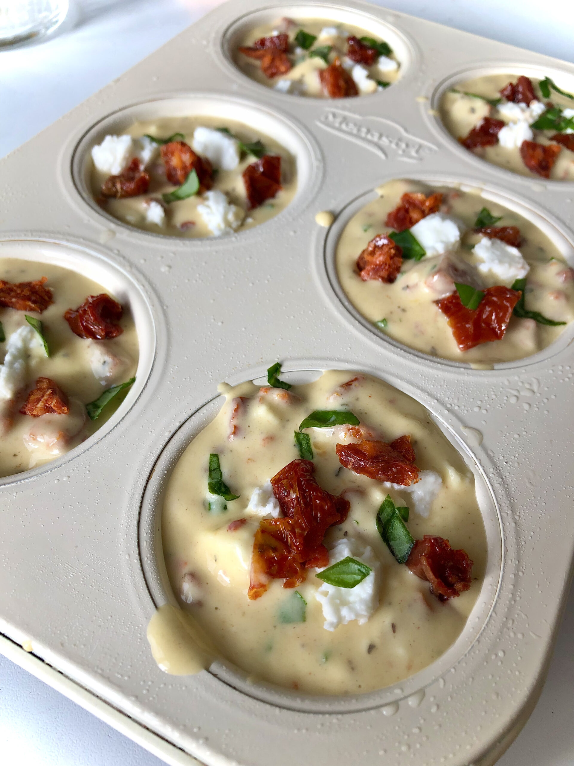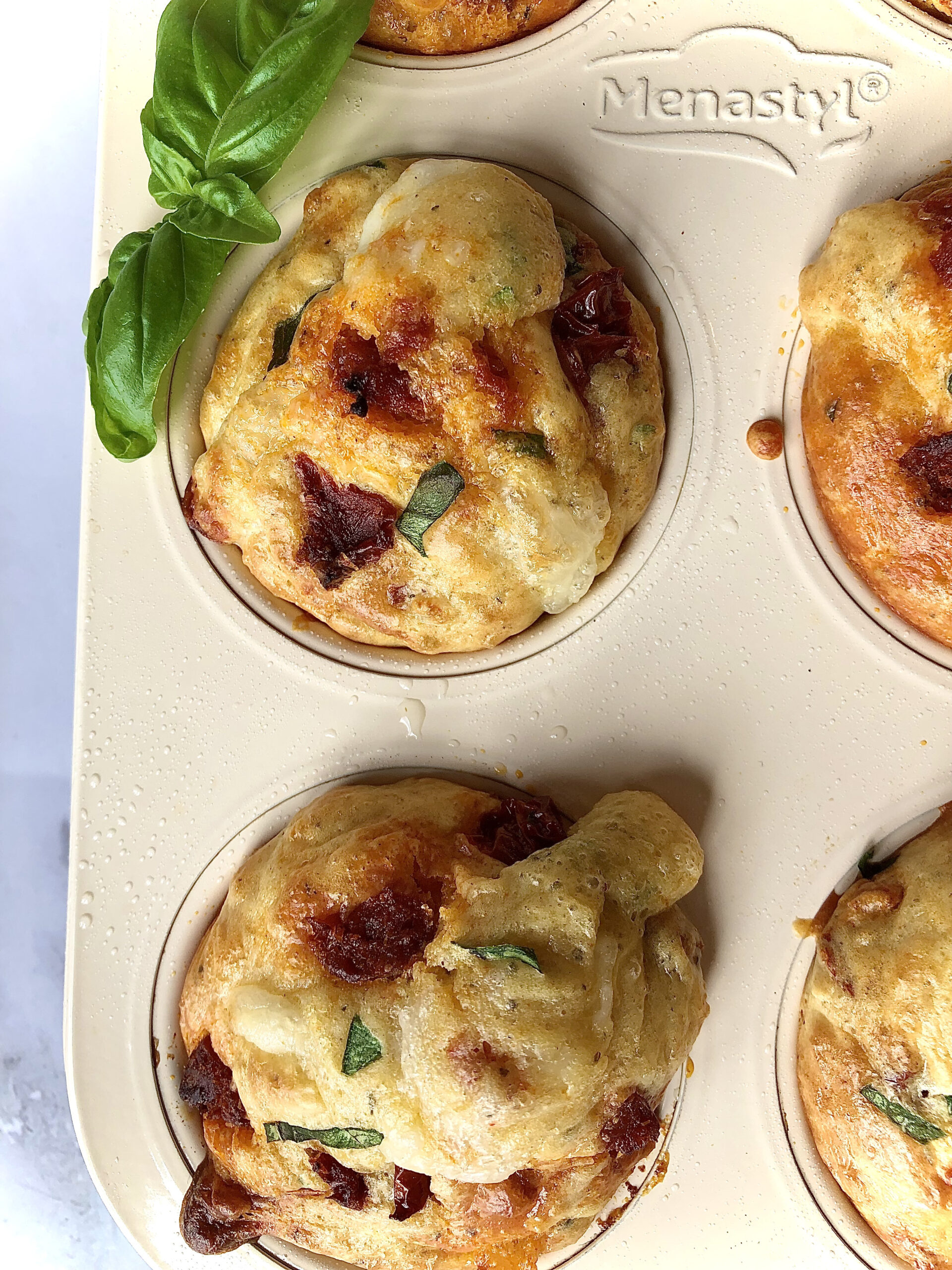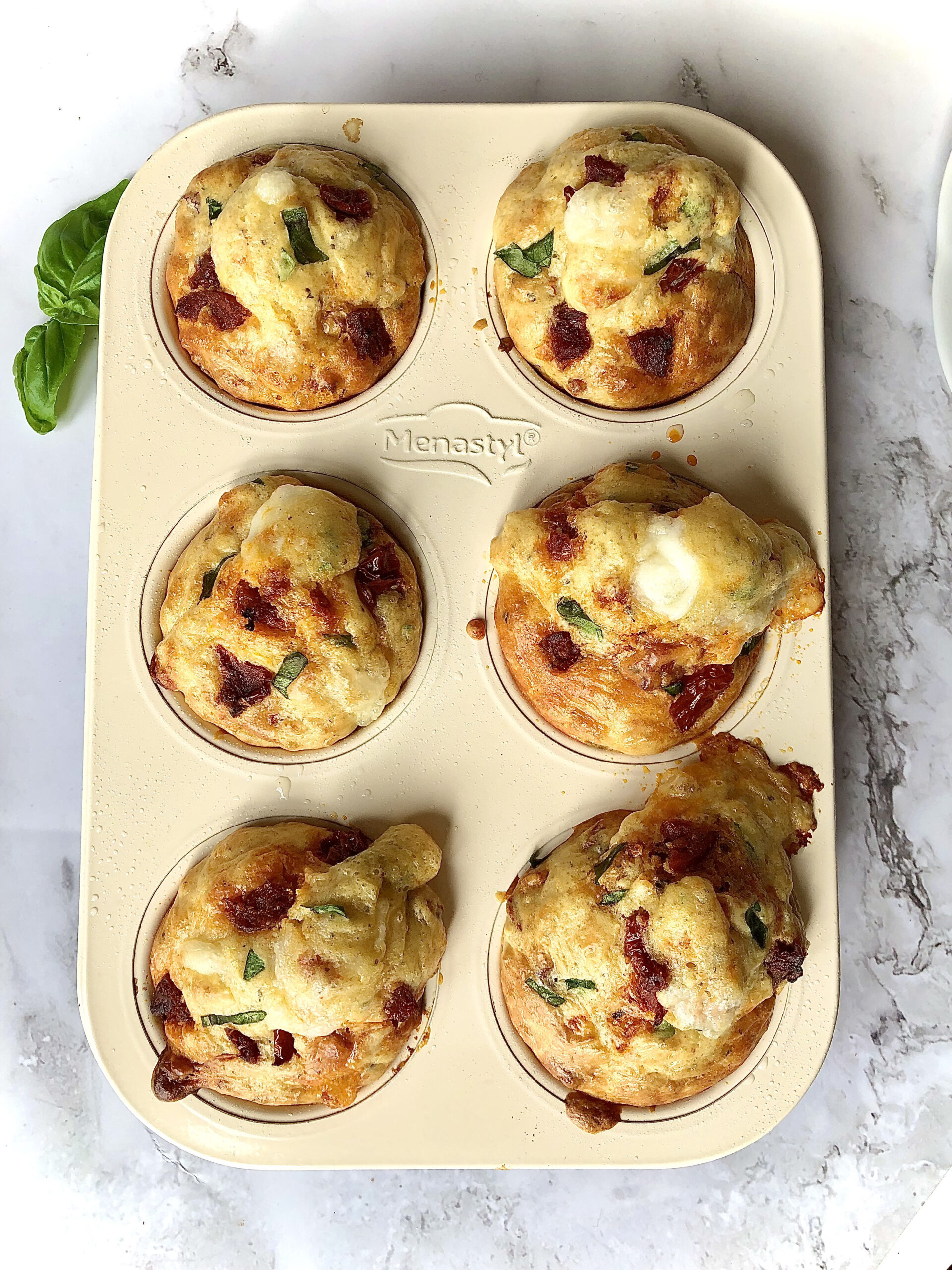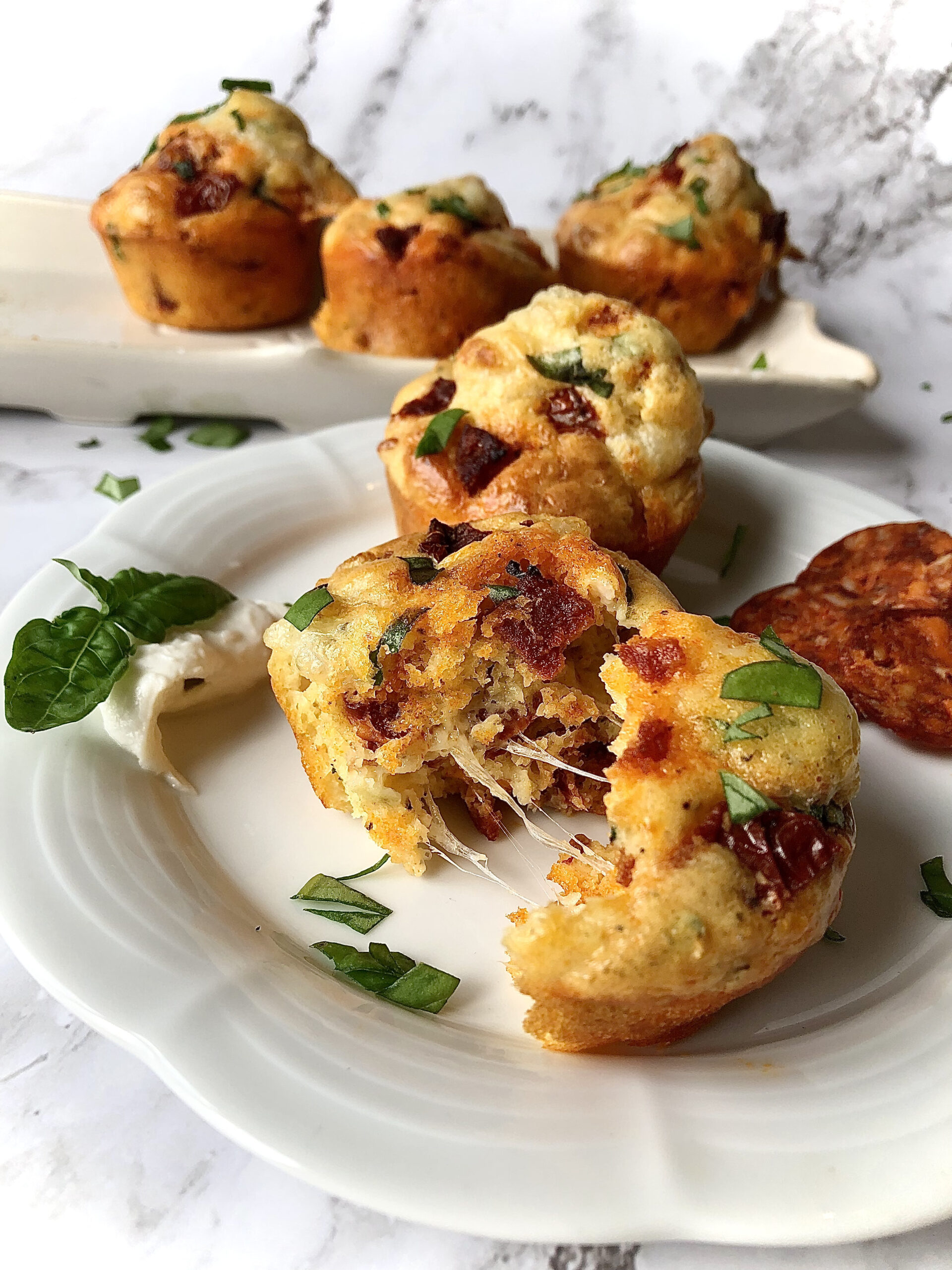 7. Garnish the top of the muffins with basil, pepperoni, and cheese.
