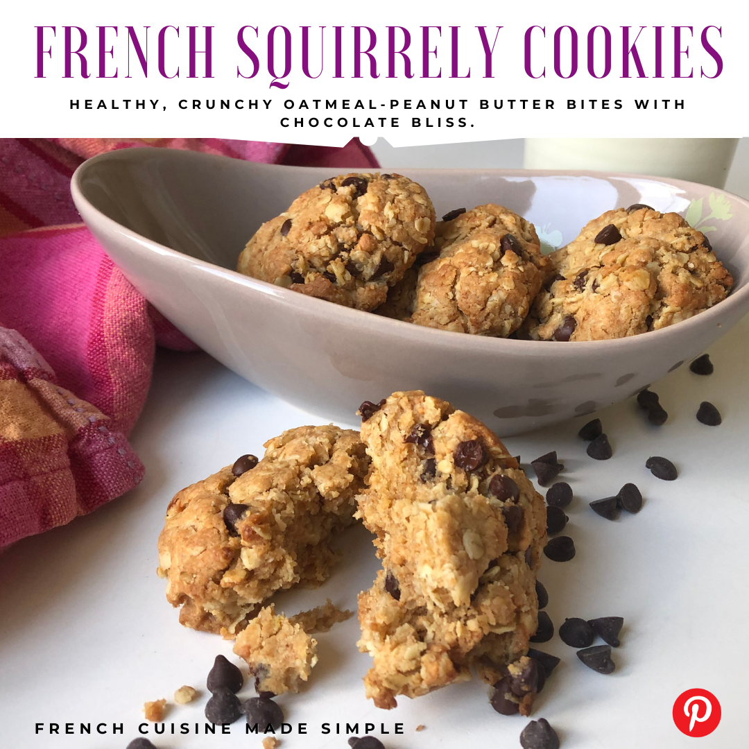 Crunch! These healthy oatmeal, peanut butter, chocolate cookies are a perfect little bit to satisfy your sweet tooth during the day. I stole this recipe from my Frenchie husband’s aunt. When she made these cookies, the ingredients were so perfectly balanced as one ingredient did not overpower another. I simply love the squirrely hardy crunch they make. I continue to make them for my kid’s snack and for my little sweet tooth during the day! Don’t forget there is a gluten-free option in the recipe! Enjoy!